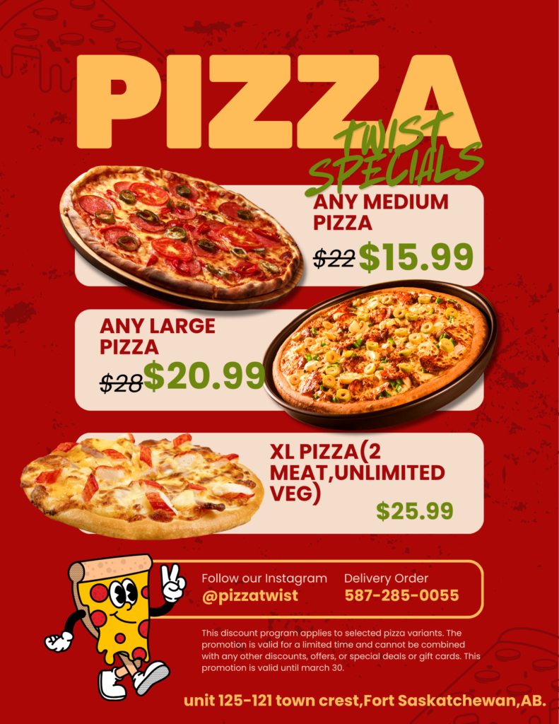 At Pizza Twist, we’re all about bold flavour and fresh quality. Our menu brings a delicious twist to your favorites—from handcrafted pizzas and juicy burgers to crisp salads and saucy wings. We make our dough fresh in-house every day and use only the freshest ingredients to ensure every bite is full of flavor. Whether you’re craving a classic combo or something new, Pizza Twist offers something for everyone—made fast, made fresh, and made to satisfy.